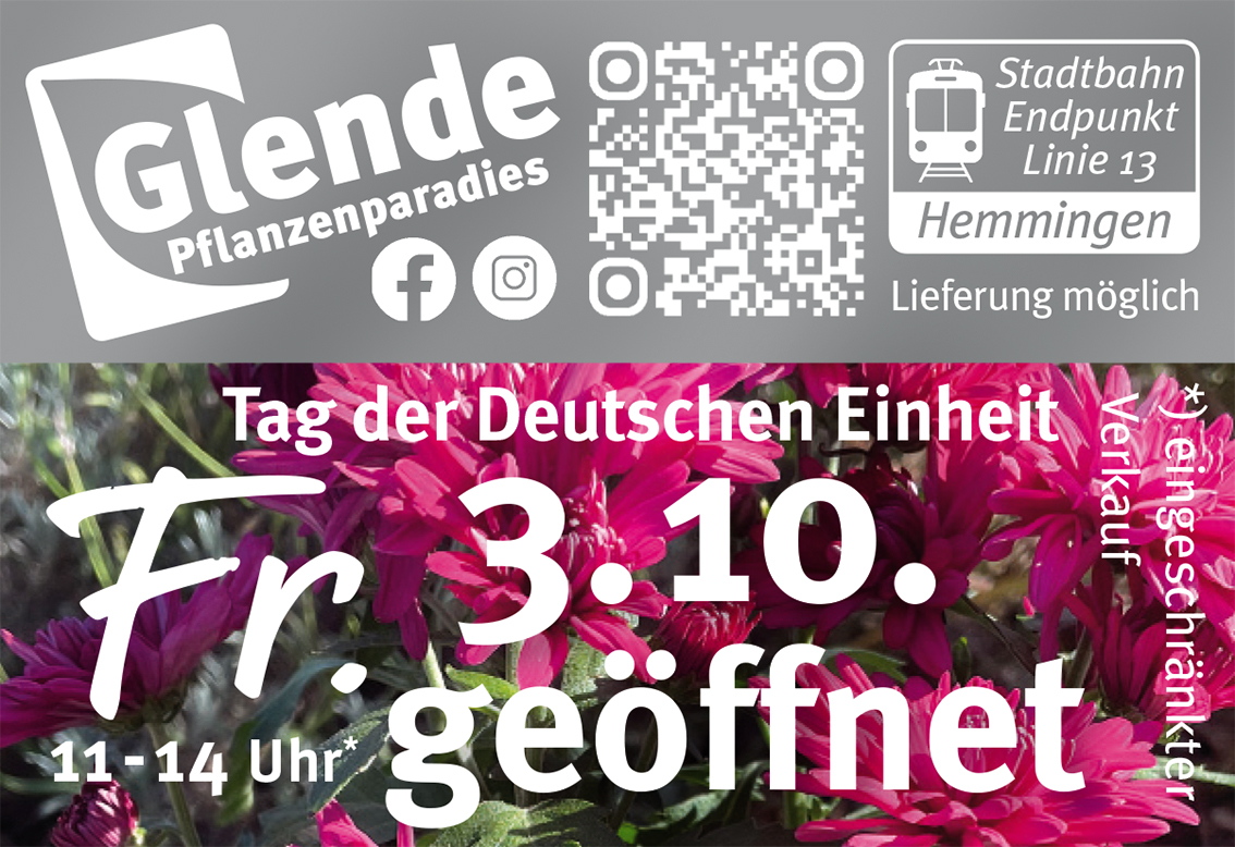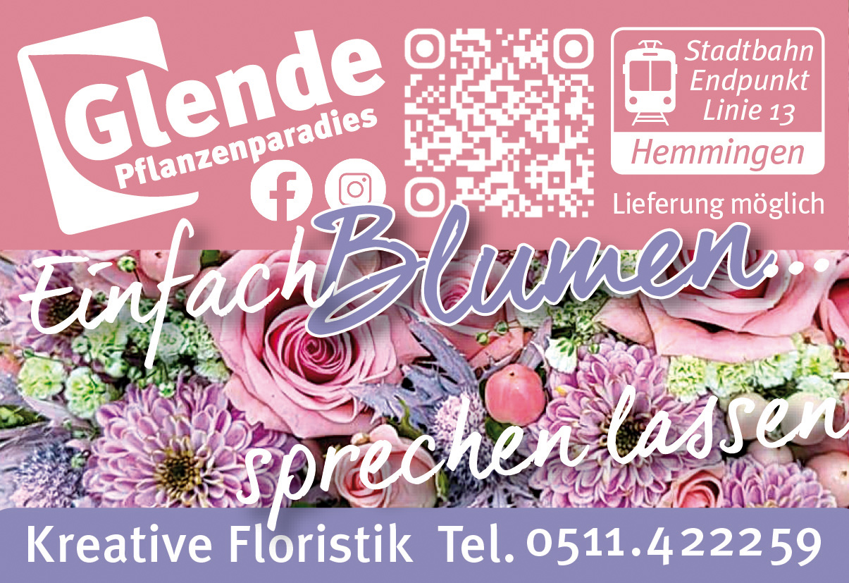 Seit über 30 Jahren betreibt unsere Familie mit einem engagierten und fachkundigen Team das Glende Pflanzenparadies in Hannover-Hemmingen - direkt am Standbahn-Endpunkt Linie 13. Es liegt uns am Herzen, Ihnen sowohl alte und selten gewordene Edelsorten, als auch auch Modernes für Haus und Garten zu bieten. Umfassende Beratung und guter Service werden Sie überzeugen - ebenso unser familienfreundlicher Spielplatz mit Tierwiese oder unser Lieferservice. Schauen Sie vorbei und lassen Sie sich auf unserer Ausstellungsfläche inspirieren und im wunderschönen Schaugarten verzaubern. Yvonne & Frank Glende + Team