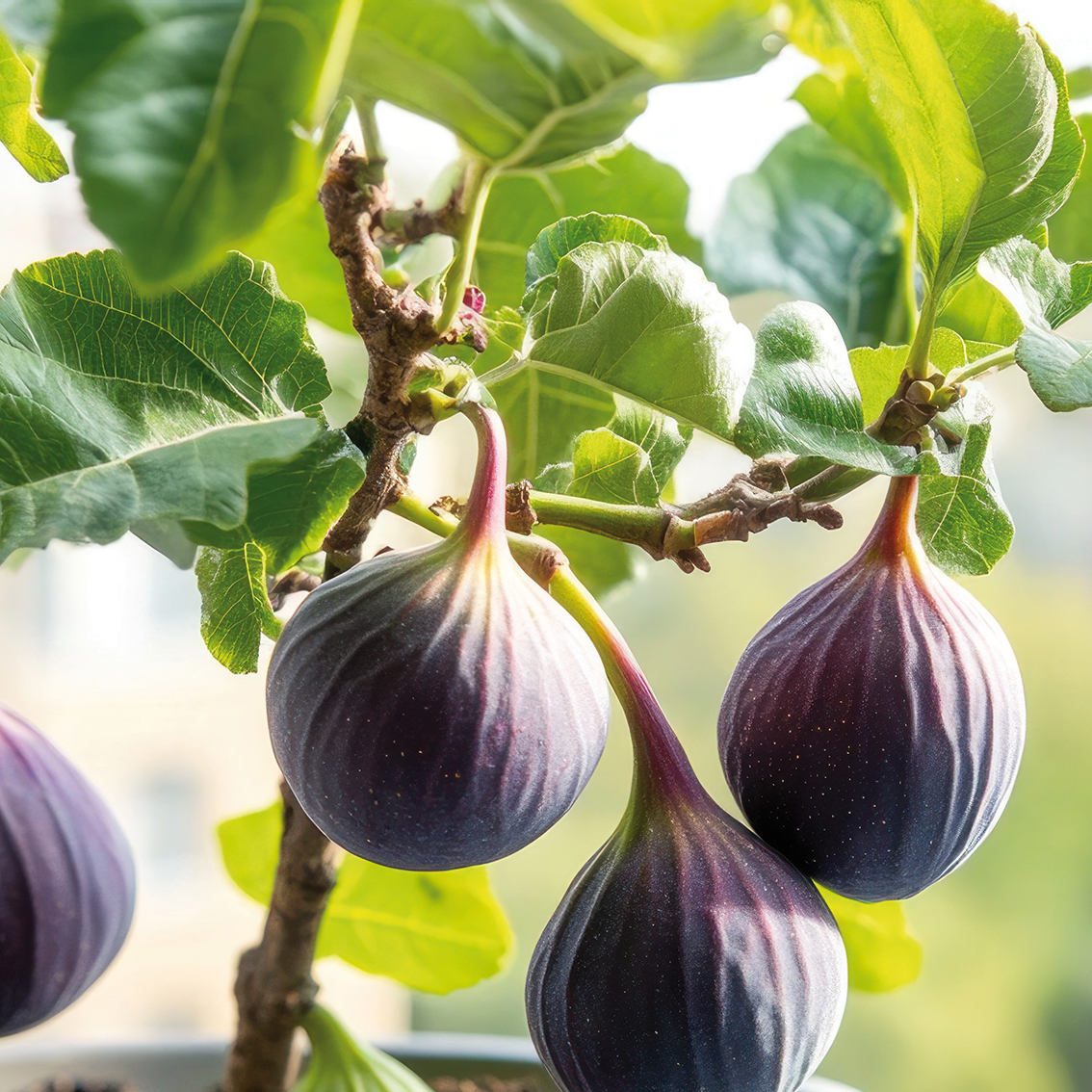 A potted fig tree with ripe figs, showcasing indoor gardening and plant care.